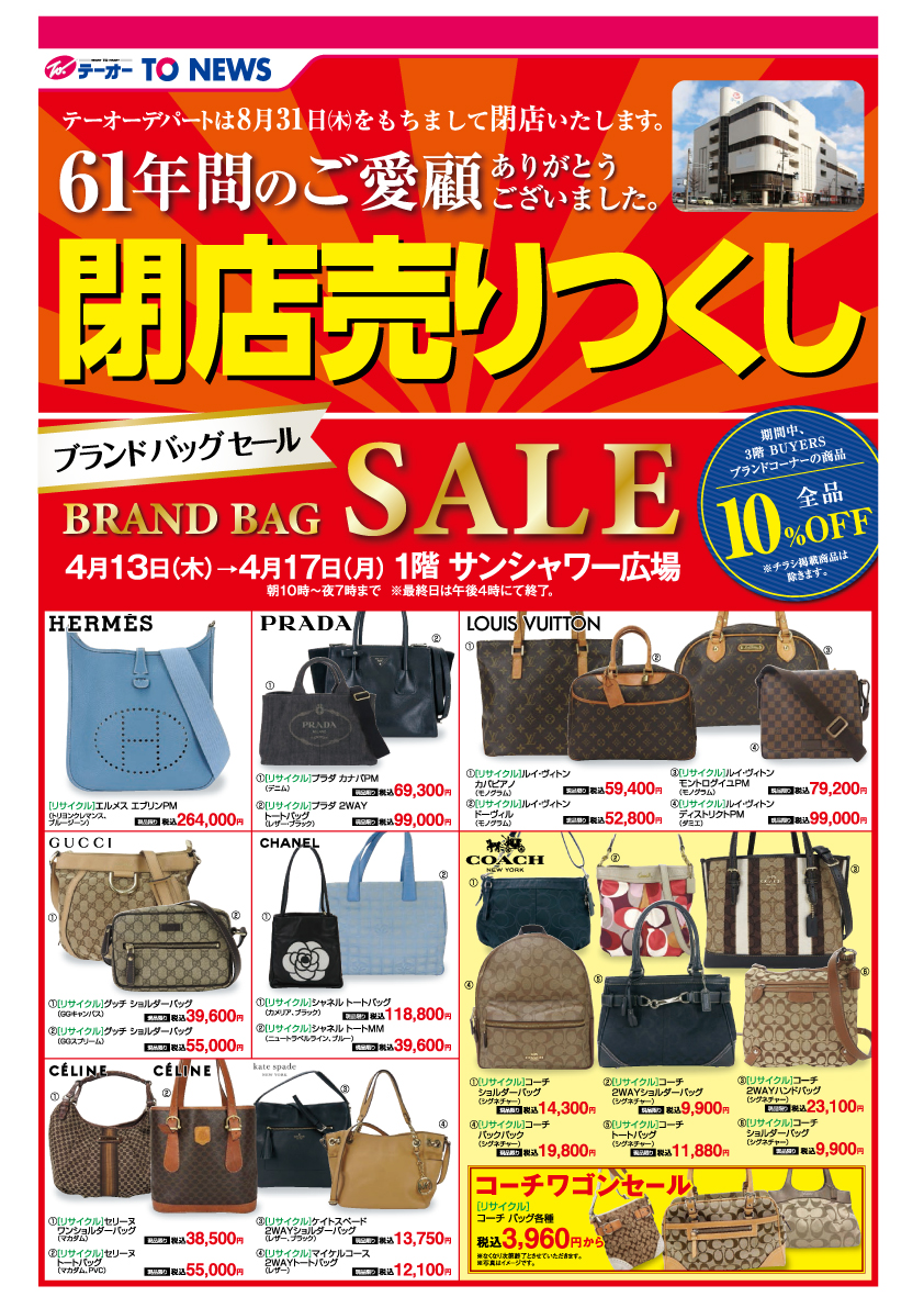 セールBUYERS閉店売りつくし〈リサイクル〉ブランドバッグセール1階サンシャワー広場特選リサイクルブランドバッグ・時計、ジュエリー金・プラチナ・ブランド品・切手・テレカ買取りを同時開催…