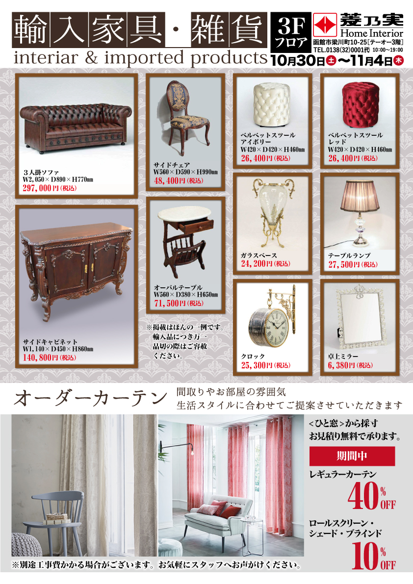 「輸入家具・雑貨特集・オーダーカーテン特別割引」